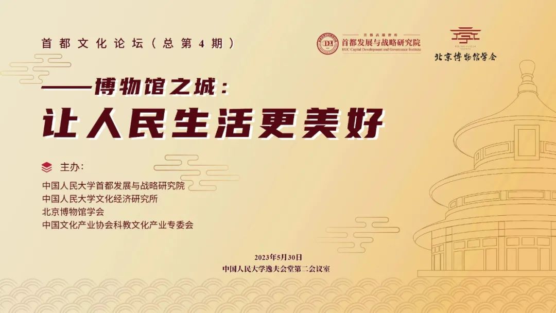 2023年5月30日上午,由中国人民大学首都发展与战略研究院、中国人民大学文化经济研究所、北京博物馆学会等共同主办的首都文化论坛(总第4期)在中国人民大学成功举办。本次论坛的主题是“博物馆之城:让人民生活更美好”。中国人民大学副校长王轶,北京市社科联副主席、市社科规划办副主任崔占辉等出席会议并致辞。