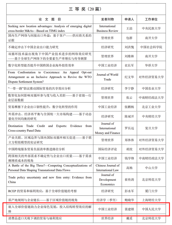 近日,第二十三届 “安子介国际贸易研究奖” 评奖结果公布。新葡京官网 教授裴建锁、博士生方勇彪(通讯作者)与北京工商大学讲师姜佳彤发表于《中国工业经济》2024年第2期的论文《嵌入全球价值链助力企业绿色发展:投入结构转型效应的解释》荣获“优秀论文奖”三等奖。