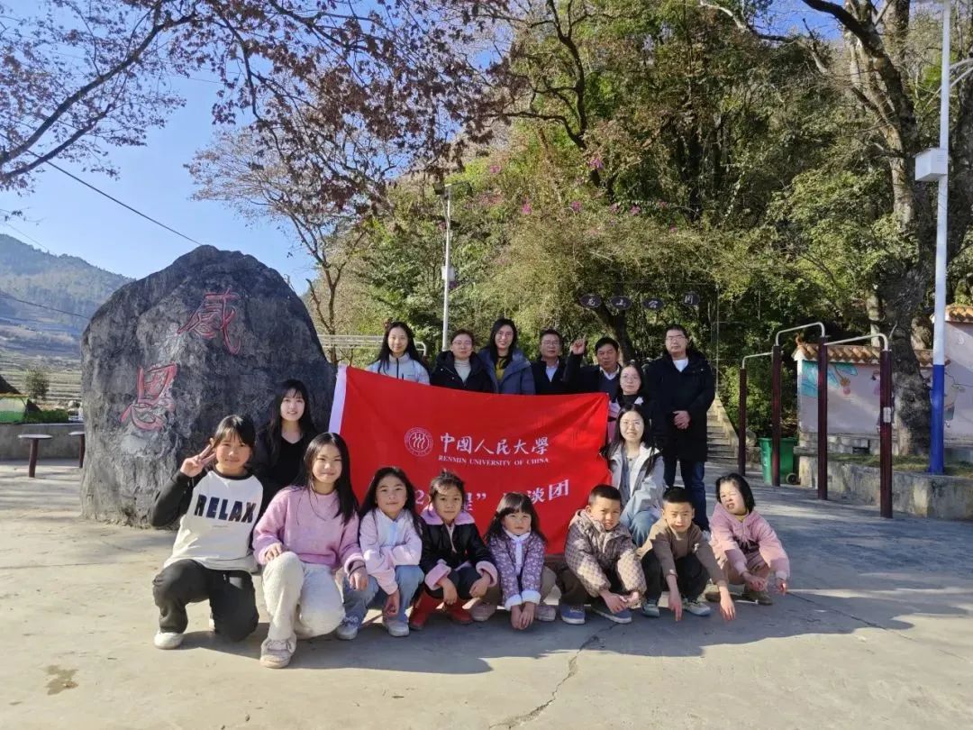 ▲调研团在蚌峨乡六掌村大寨村小组和孩子们合影