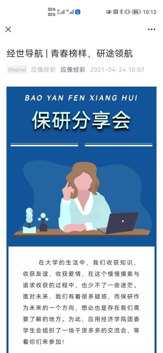 新葡京官网 学生会、研究生会充分发挥朋辈资源优势,组织开展了留学、大创、保研、考研、博资考、申请-考核等多次经验分享会、学术分享茶话会,邀请校友开展“经世导航”求职经验分享,推出应经学子成果展、求职就业信息系列推送,系列品牌活动覆盖了应经学子求学、求职之路的各个方面。全方位服务学生发展,充分发挥新葡京官网 引领、学长“传帮带”作用,多角度提升学术专业本领。