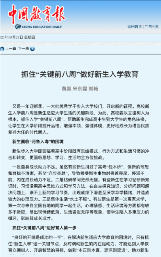 新生、新入职教师及师生党员讲授“开学第一课”;通过开学典礼、新生见面会、家长见面会等活动,做好入学思想引领教育;新生入学前发放问卷,全方位摸排同学们的个性化需求,将“我为师生办实事”做前、做实、做细。“关键前八周”项目获评学校基层学生思想政治工作优秀项目,相关经验总结提炼后发表在《中国教育报》,向全国推广。