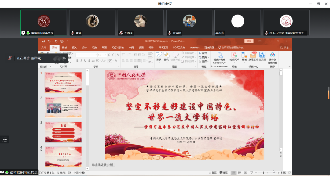 国民经济管理系教师党支部谢伦裕,在师生联合主题党日中以“扎根中国大地育人育才,做‘经师’与‘人师’的统一者”为主题开展领学,回忆在现场聆听习近平总书记看望老教授、老专家和中青年骨干教师代表时发表的重要讲话的感受,分享通过“中华人民共和国脱贫攻坚史”系列调研访谈项目,建构中国自主的知识体系的宝贵经验;在思政课现场教学时现场聆听总书记教诲的房俊江,在本科第一党支部,区域与城市经济学博士第一党支部等党支部讲述自己在“玉章故里讲述玉章故事,支教路上践行青春誓言”的支教故事;学校延河讲师团、博士生宣讲团讲师为产业经济学博士党支部讲述“坚定不移走好建设中国特色、世界一流大学新路——学习习近平总书记在中国人民大学考察时的重要讲话精神”主题党课。教职工党支部跨系所、跨学科交流研讨,学生党支部跨支部、跨院系联合学习;专家学者、先进典型开展专题宣讲,加强领学研学,形成了院内院外联学共建、不同系所沟通交流、师生员工融为一体的学习氛围。