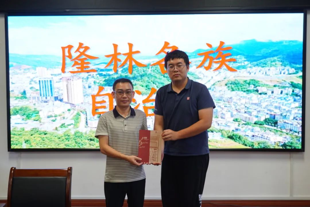 ▲郝浩宇向隆林各族自治县水利局党组书记、局长刘杰赠送纪念品