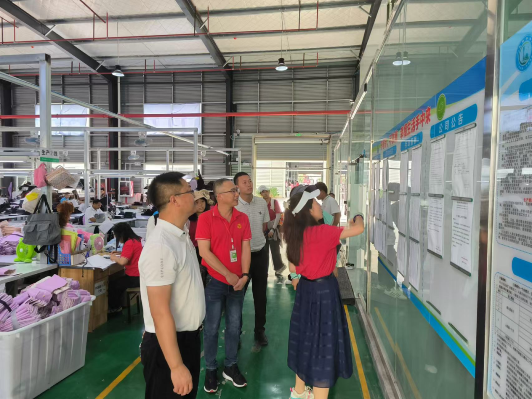 ▲调研团参观钧裕皮具厂扶贫车间内公示栏