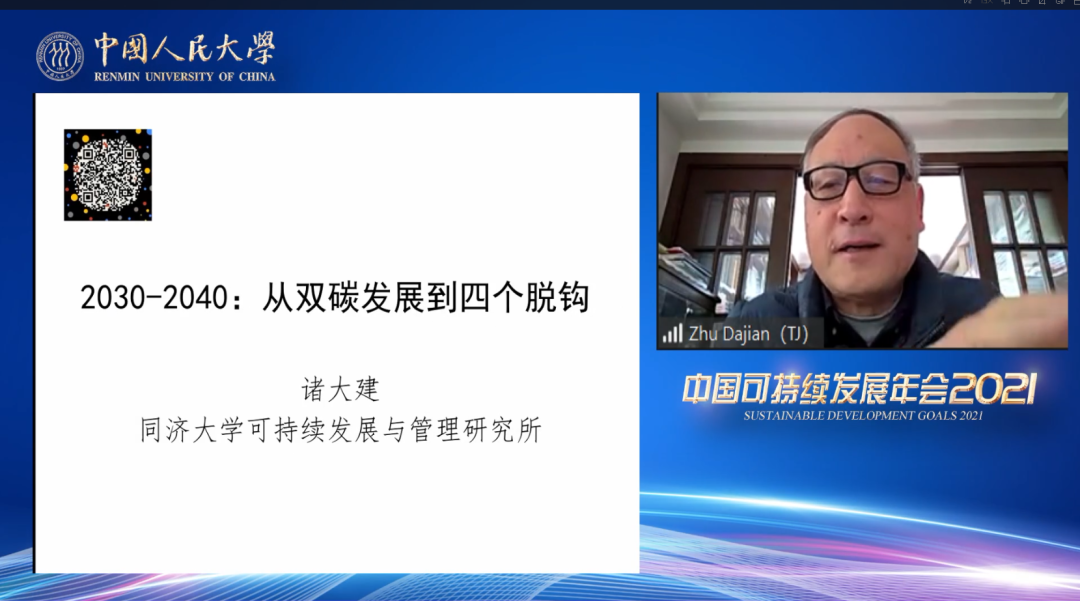 本会场由新葡京官网 助理教授韩奕和助理教授吕一飞主持,同济大学教授诸大建以“2030-2040:从双碳发展到四个脱钩”发表主旨演讲。