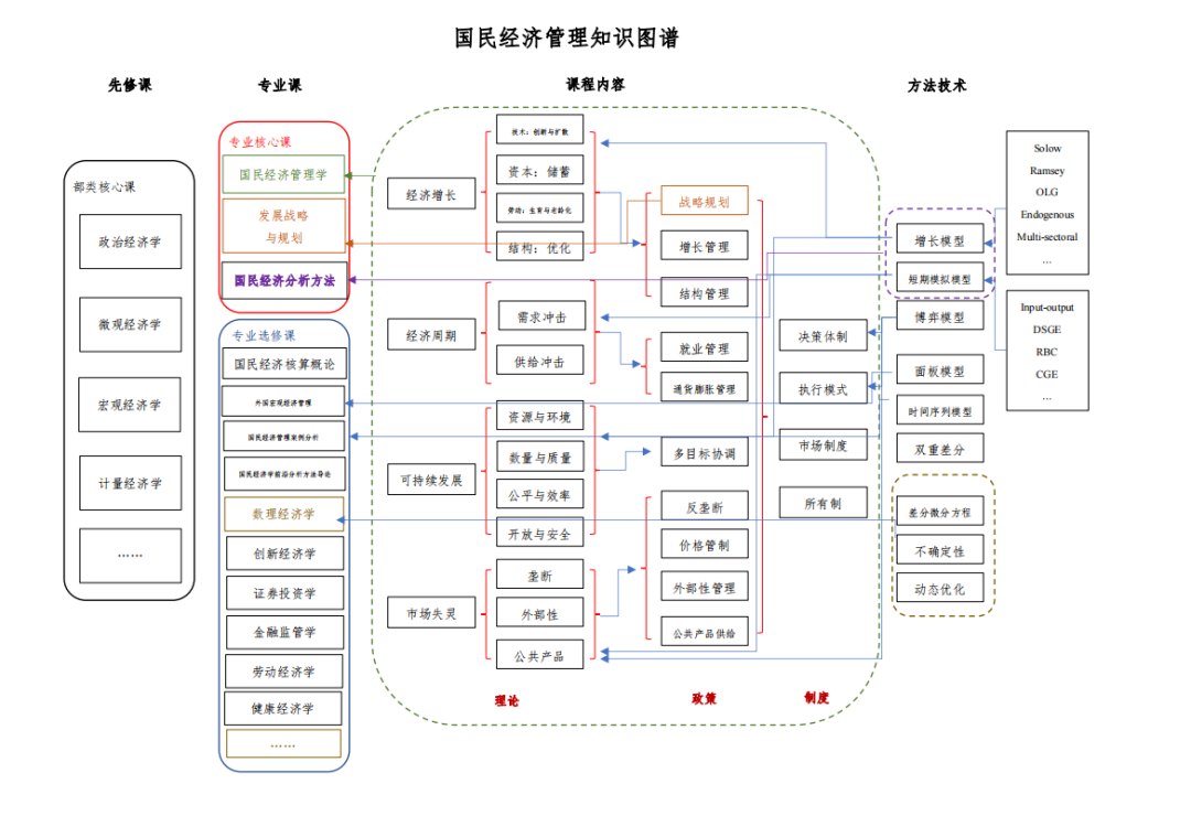 面向人工智能、大数据等时代新要求和新变化,系统梳理各二级学科的基础理论、中国制度、政策环境、方法技术、数据支撑等关键要素,构建适应人工智能新时代、充分运用人工智能助力教学科研的应用经济学学科知识图谱。同时以学科知识图谱为指引和遵循,重构研究生教学体系,构建本-硕-博纵向衔接、横向协同的贯通课程体系。