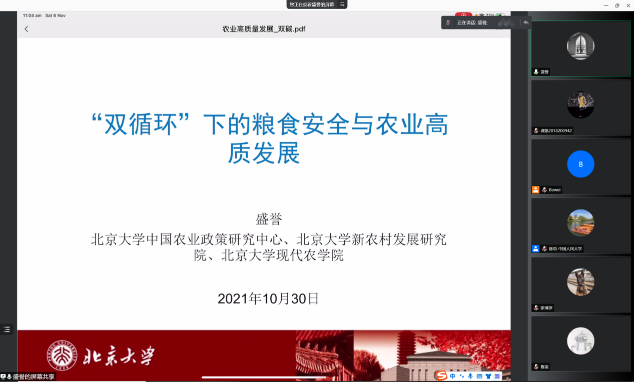 北京大学现代农新葡京官网 副教授盛誉以《双循环下的粮食安全与农业高质发展》为主题进行展示。他从我国农业发展历史和现状、“双循环”下农业发展特征、中长期农业发展对策三个方面分析了双循环下如何保障粮食安全以及如何推进农业高质量发展。