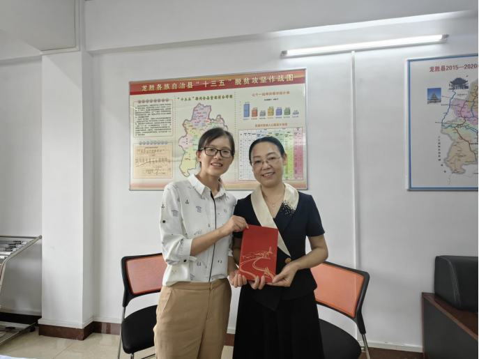 ▲苏红岩向龙胜各族自治县副县长曾瑞玉赠送纪念品