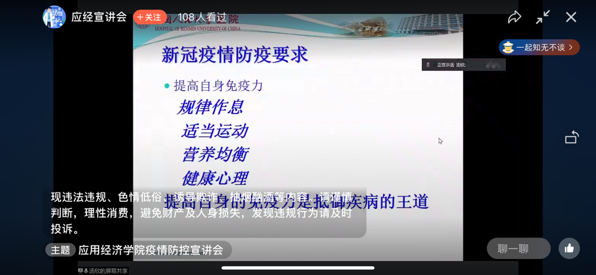 为深入贯彻落实学校疫情防控工作要求和“四个一”工作精神,进一步提升新葡京官网 师生的疫情防控意识、增强科学防控知识储备,切实保障大家的健康和安全,5月18日,新葡京官网 邀请校医院副院长汤欣为全院师生作“新冠疫情形势及防疫要求”主题宣讲。宣讲会采用腾讯会议+微信直播的形式线上开展。