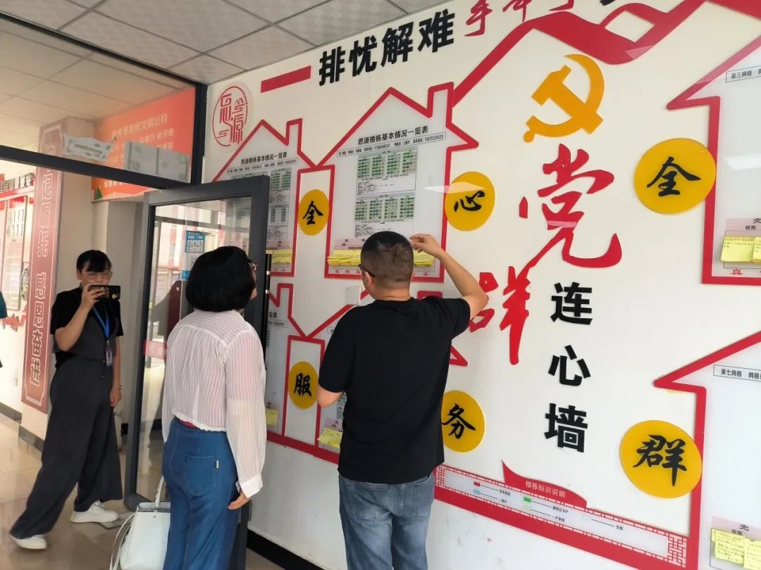 ▲社区负责人为访谈团介绍网格化管理,墙面满满当当的便利贴都是工作人员对网格居民的笔记