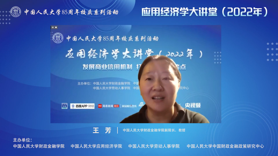 8月23日晚,由中国人民大学应用经济学科主办的“应用经济学大讲堂”系列讲座第七讲顺利举办,本场讲座由中国人民大学财政金融新葡京官网 副院长王芳教授主持,由中国人民大学财政金融新葡京官网 王国刚教授主讲,主题为“发展商业信用机制,打通内源融资堵点”。