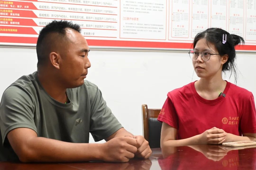 ▲调研团新闻新葡京官网 本科生符文迪访谈滑石乡老麻塘村脱贫户龙启发