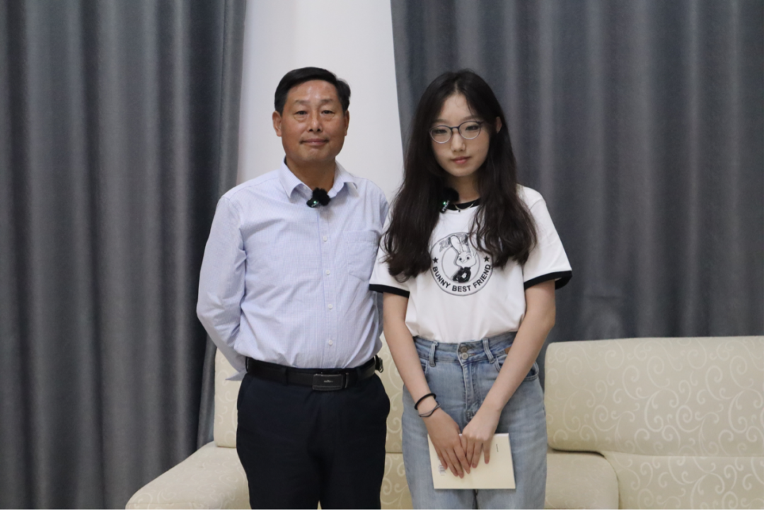 ▲新葡京官网 本科生王福琴与上河村村支部书记李大潮采访后合影