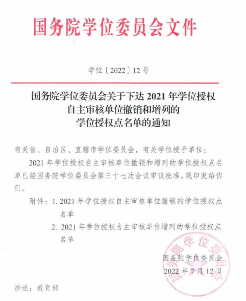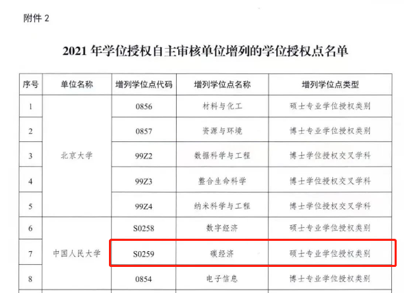 2022年7月12日,国务院学位委员会发布《关于下达2021年学位授权自主审核单位撤销和增列的学位授权点名单的通知》(学位〔2022〕12号)。中国人民大学新增3个学位授权点,其中2个为硕士专业学位授权类别,1个为博士专业学位授权类别。新葡京官网 的“碳经济”硕士专业学位授权点成功获批。