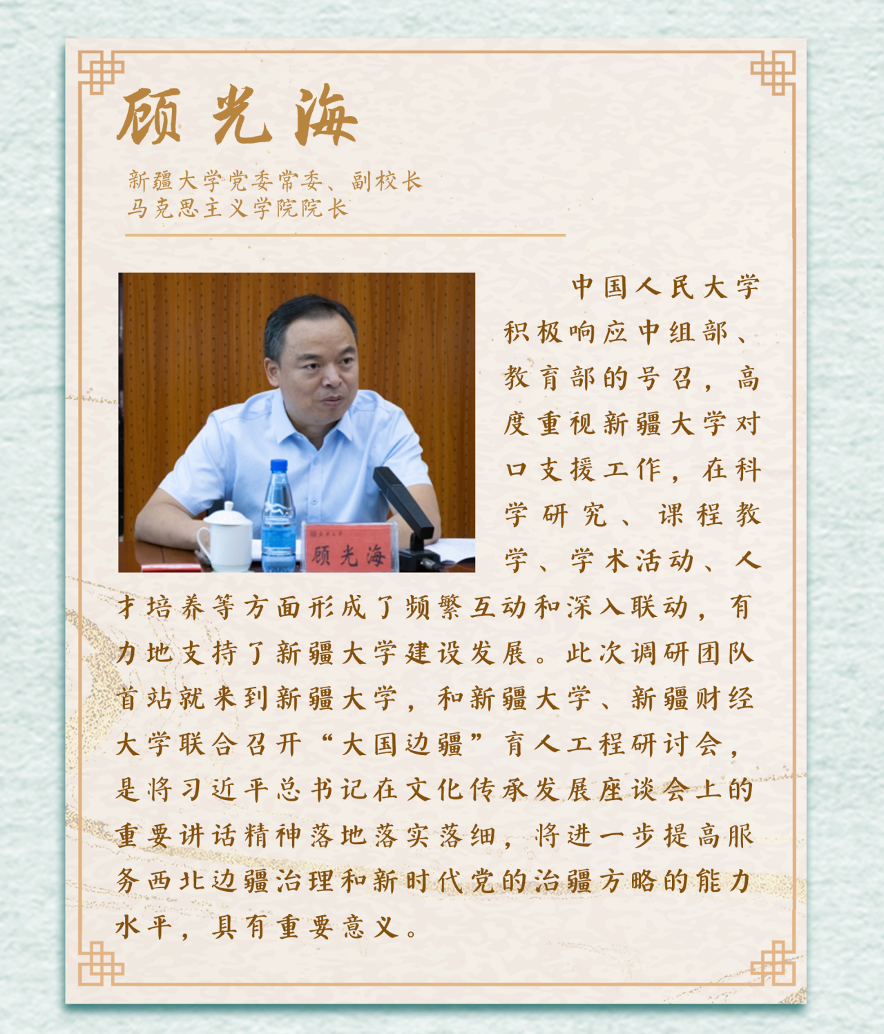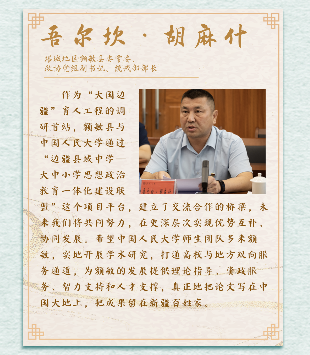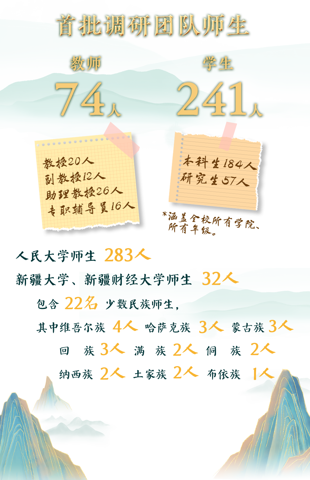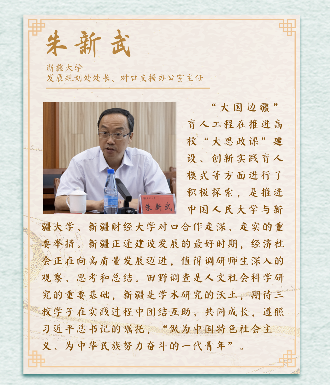 7月,在新疆维吾尔自治区教育厅的大力支持下,“大国边疆”社会调研团第一站来到美丽的新疆,以“把握新时代党的治疆方略,讲好中国式现代化新疆故事”为主题,由中国人民大学联合新疆大学、新疆财经大学两所对口支援高校联合组建10余支教授领衔、“青椒”带队、本研一体的学术团队,分三路奔赴和田、喀什、阿克苏、克州、博州、塔城、阿勒泰、昌吉等9个地州34个边疆县,开启“大国边疆”(第一季)社会调研,努力用学术语言讲好新时代新疆磅礴气象之大、山河壮丽之美、人文璀璨之厚、民族团结之和、开放发展之进的新故事新气象。