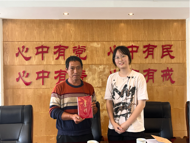 ▲新葡京官网 博士生杨力权访谈向阳乡旧寨村委会驻村第一书记唐贵仁后赠书留念