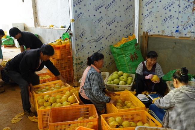 ▲七彩红河队在午街铺镇高原梨种植和分拣基地调研