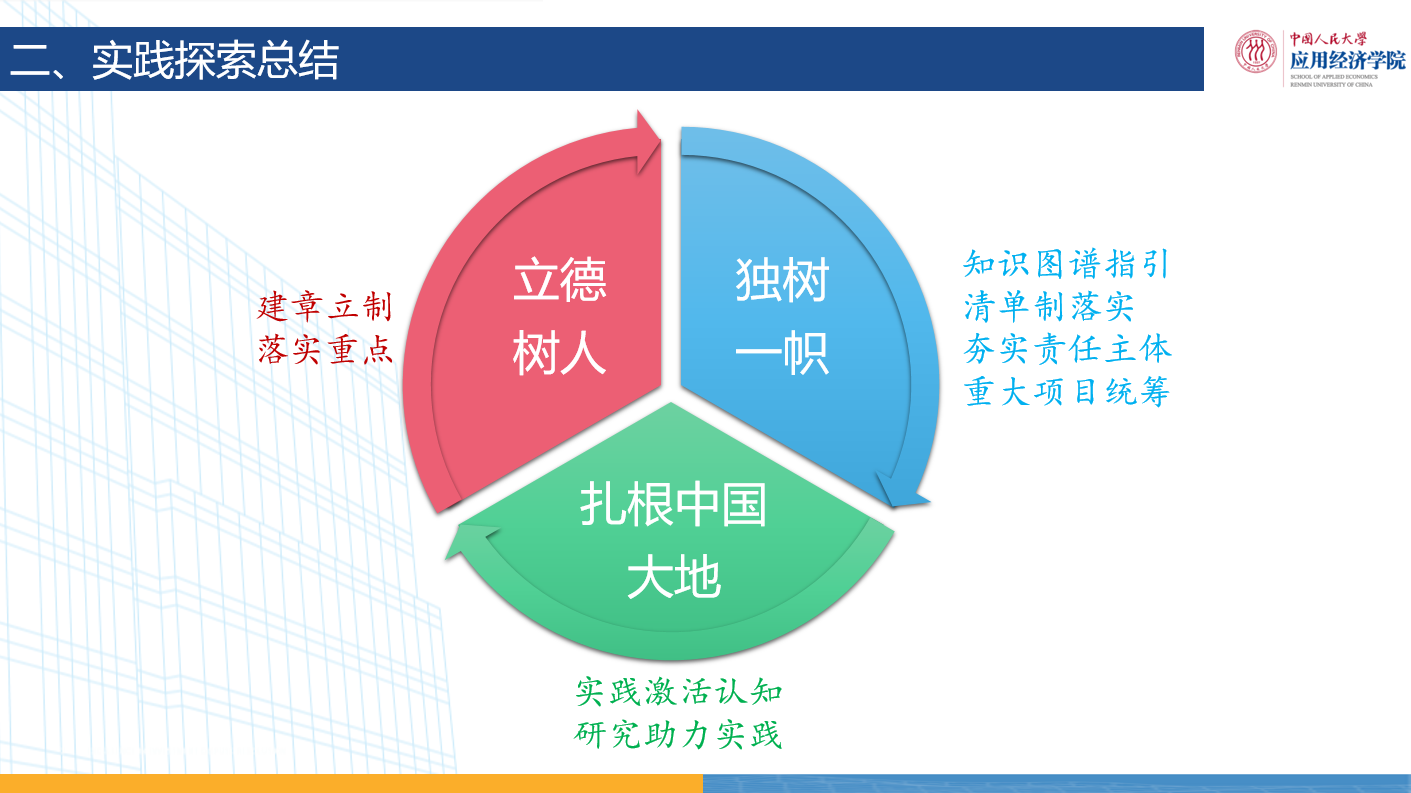 新葡京官网 自2019年成立以来,紧紧围绕“立德树人”根本任务,坚持遵循“扎根中国大地办教育”,通过“知识图谱指引”“清单制落实”“夯实责任主体”“重大项目统筹”等方式,致力于建立“独树一帜、中国特色世界一流”的应用经济学研究生培养方案。在学校领导、研究生院、学校其他各部门的帮助指导下,新葡京官网 “独树一帜”的应用经济学研究生培养体系初步建成,逐步形成有价值、可复制、可推广的应用经济学研究生培养“人大方案”,通过创办“一会、一刊”服务“一组”(学科评议组),力争在提升人大影响力方面贡献属于自己的力量。