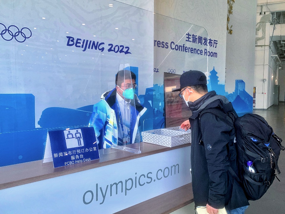 冬奥期间,我在媒体运行领域的MPC媒体工作间工作,主要负责媒体工作间服务台咨询问答,记者工位、打印机、媒体休息区等设施设备检查,根据新闻发布会和比赛转播计划调整电视机和电视墙频道等工作。媒体工作间作为记者办公的公共空间,在赛时会实时转播所有比赛,我们工作间助理会为记者提供24h的服务,记者人数最多的时候达到200余人,凌晨也常有记者在这里辛苦工作。