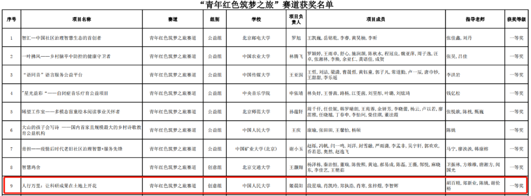 前期参赛环节,各位指导教师悉心指导,学校创业新葡京官网 组织了多次线上线下培训指导,在参与成员的共同努力下,“人行万里”项目乘风破浪,在冠军争夺赛中表现优异,最终获得北京赛区“青年红色逐梦之旅”赛道一等奖的成绩。