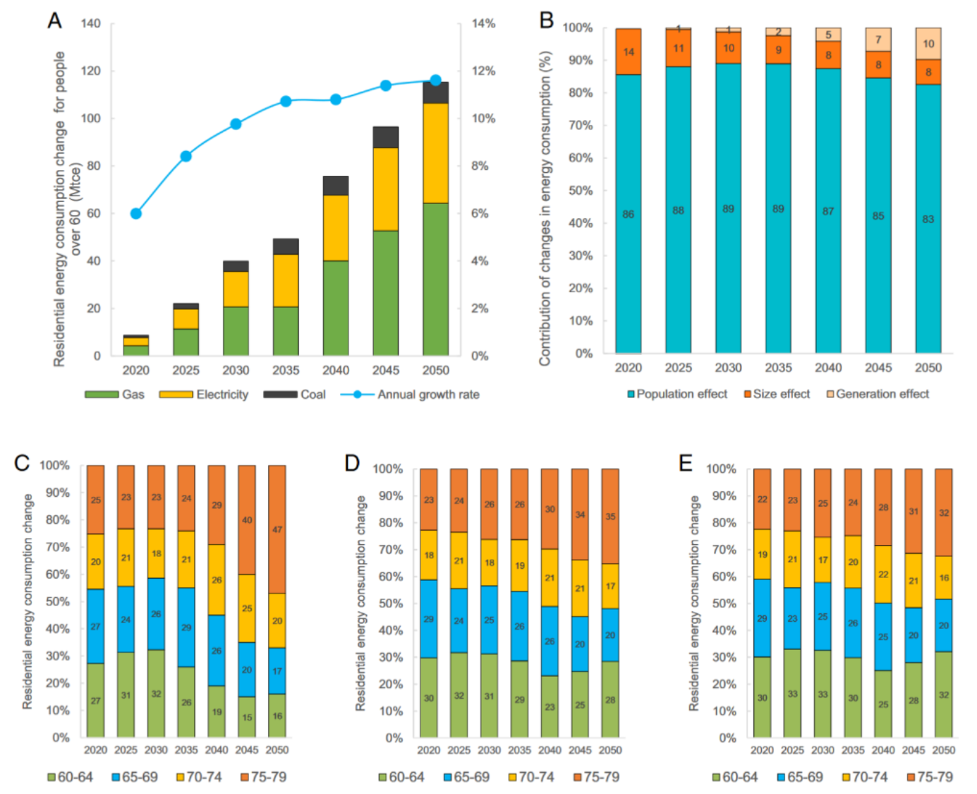 图2 预测结果(A. 人口引致的居民能源消费变化;B. 居民能源消费预测中的人口、家庭规模和代际效应;C-E. 预测的居民煤炭、电力和天然气消费中各年龄组老人所占比重)