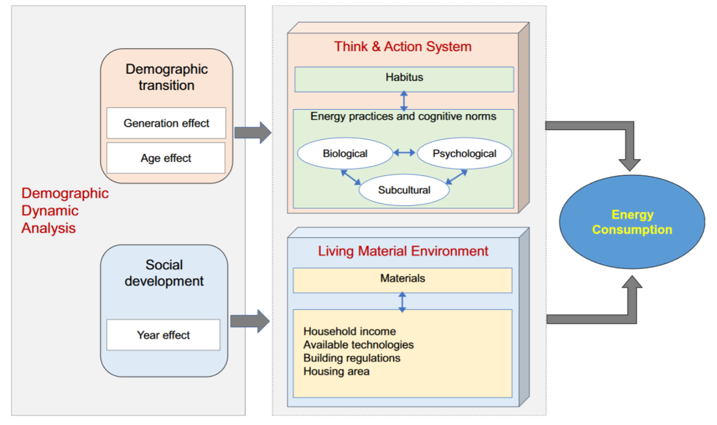 该研究以能源需求为研究对象,构建了更精准刻画和捕捉年龄和代际变迁对需求影响的理论框架(图1),用代际效应刻画各代人异质认知规范和行为模式,用年龄效应刻画个体生命周期中不同的行为模式。基于中国城市居民微观调查数据构建“年龄-时期-队列”(APC)来进行实证估计,结合多态预测模型(Multistate projection models)测算的城镇老龄人口,预测评估了未来不同情景下人口因素对中国能源消费的影响。