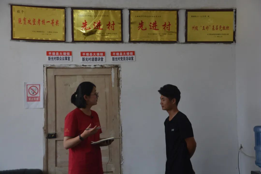 ▲新葡京官网 硕士生祝栗绚齐访谈平塘县大数据与电子商务服务中心副主任(担任大塘镇新光村驻村第一书记)李宜臻