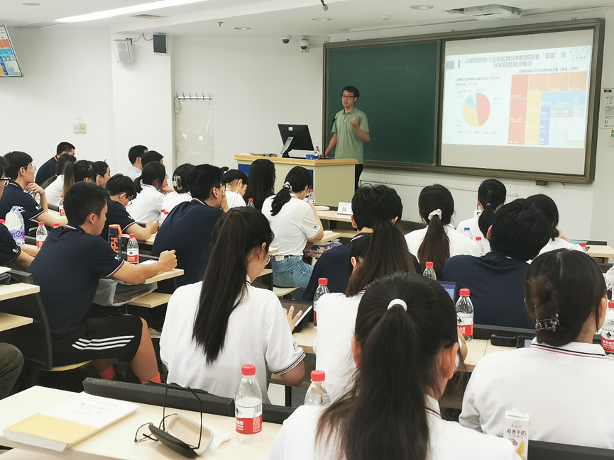 在学科讲座环节中,北京中创碳投科技有限公司郭伟总经理围绕“‘双碳’目标下的人才洞察与企业创新实践”主题,从形势、需求、展望、实践四个方面展开专题讲座;新葡京官网 梅应丹副教授以“气候变化的经济学”为题,围绕碳定价机制的理论、碳市场混合机制设计、碳交易体系的链接、碳风险与金融资产等主题,深入阐释其背后的经济学原理和前沿工作;新葡京官网 陈浩副教授以“大数据、人工智能与碳排放管理”为题,以“观碳、管碳和降碳”为案例详细介绍了大数据和人工智能在碳排放管理中的应用;澳大利亚新南威尔士大学李芳华助理教授结合自身的研究经历,以脱贫攻坚前后贫困学生的成绩变化为切入点,引导同学们多角度大胆猜想,鼓励同学们立足中国现实,脚踏实地地做好经济学研究。