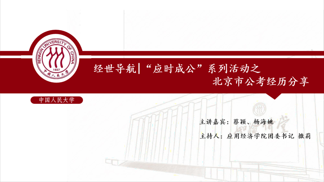 本次求职经验分享会邀请到了现就职于北京市东城区发展和改革委员会的2021届国民经济学校友蔡颖和现就职于北京市商务局的2021届国民经济学校友杨海姚,就北京公务员考试的笔面试准备、岗位内容、工作体验等方面展开分享,活动吸引了院内外约七十余人参与。